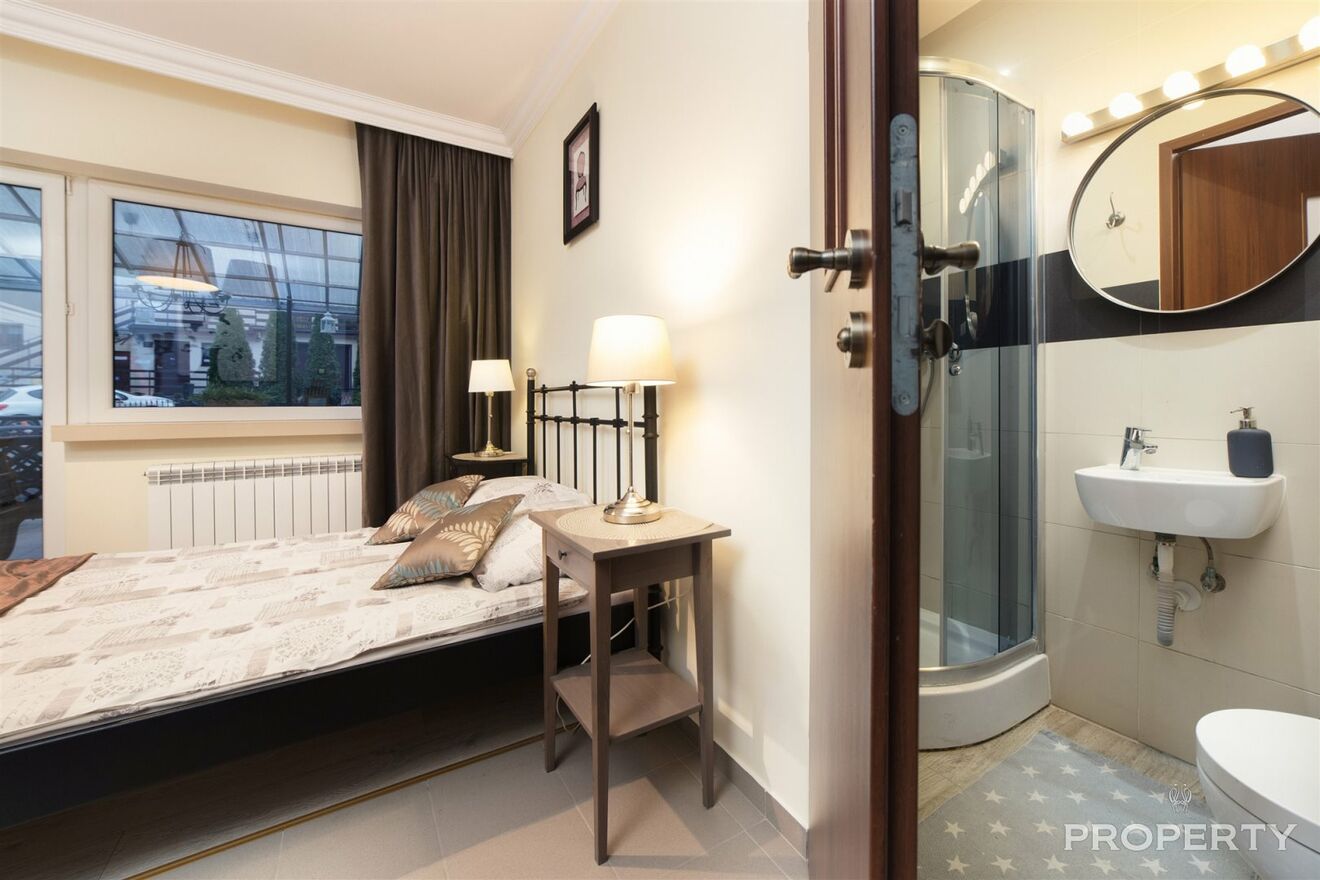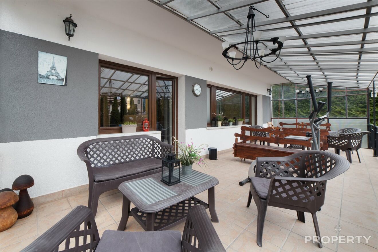 skład obiektu wchodzi : 7 łazienek, 2 kuchnie, 9 pokoi noclegowych , sauna , jacuzzi , 2 kominki, sala fitnes, sala kominkowa , spiżarnia , kotłownia, garaż, domek wolnostojący do zagospodarowania z przyłączami ,2 parkingi (na działce można postawić jeszcze jeden dom),